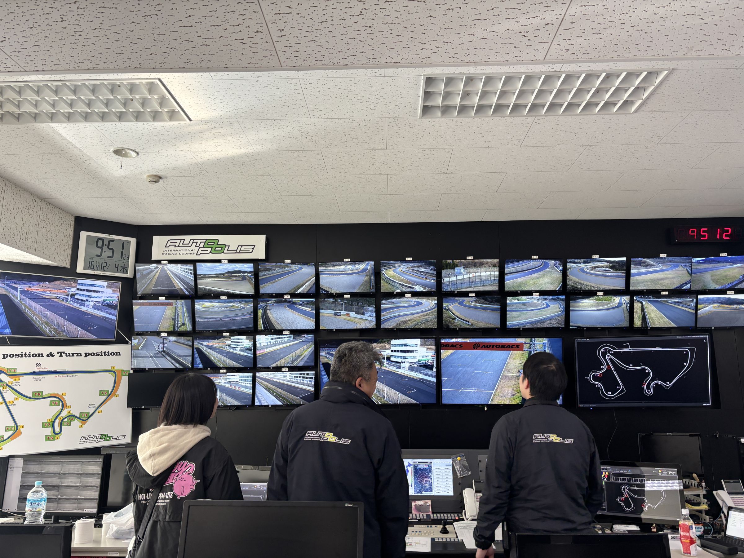 まずは、サーキットの安全を見守る「管制塔」から取材スタート。オートポリスは一周が4.7km、みずほPayPayドーム5つ分の広大な敷地があります。そのサーキット場の隅々までを確認できるように、管制室には41台ものモニターが並んでいます。映像はズームにも広角にもすることができ、細かい部分までチェックできます。