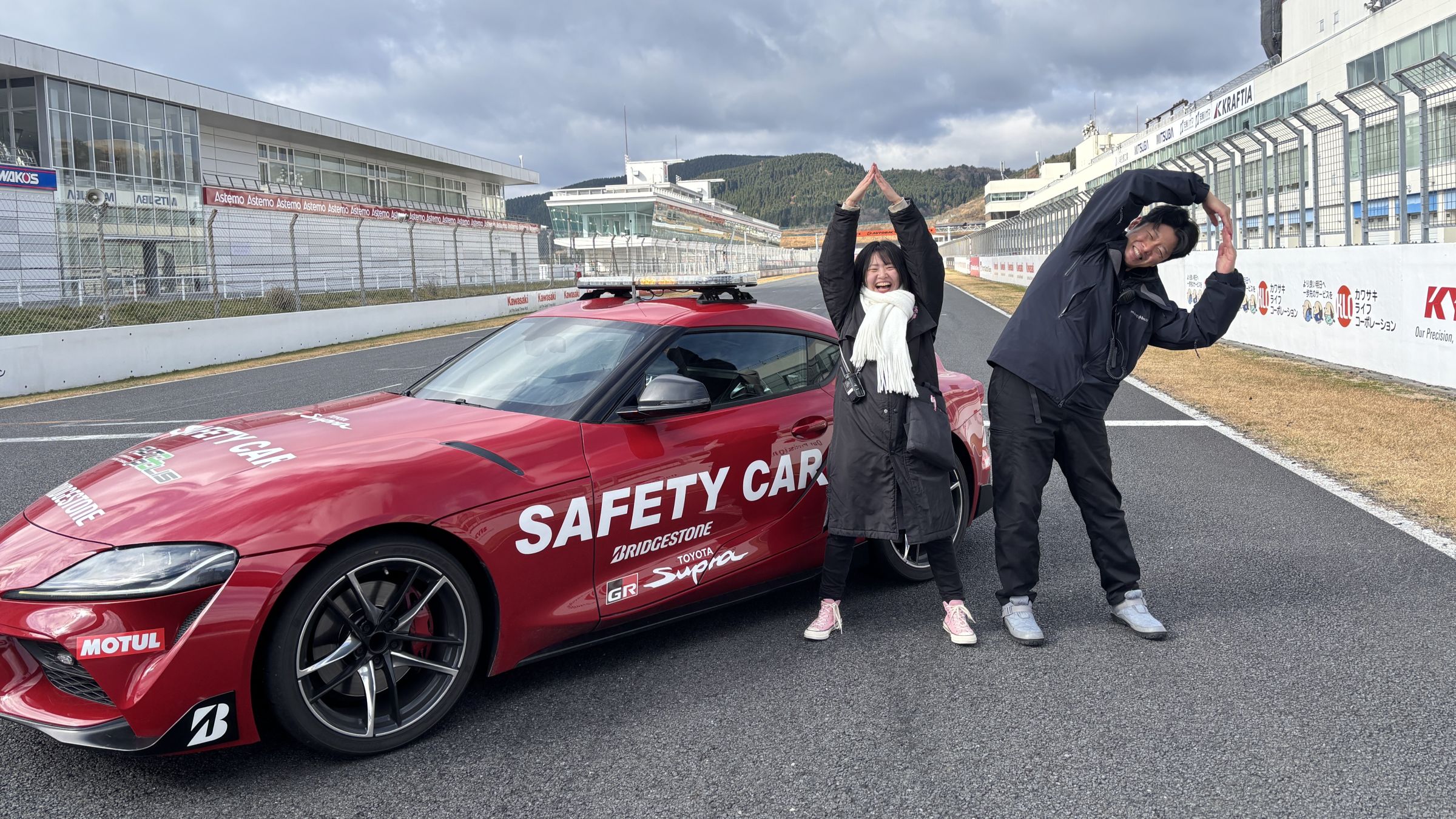 川原が乗ったのは「90スープラ」という車種。普段は走行会で走る車を先導する先導者として活躍しているそうです。最後にオートポリスの「A」と「P」のポーズで記念撮影! プロの仕事の裏側と、非日常のスピード感を体験した一日でした。