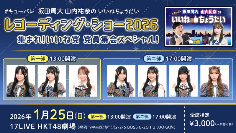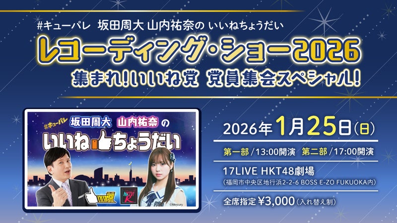 「#キューパレ 坂田周大 山内祐奈の いいねちょうだい」がレコーディング・ショー(公開録音)を実施します。