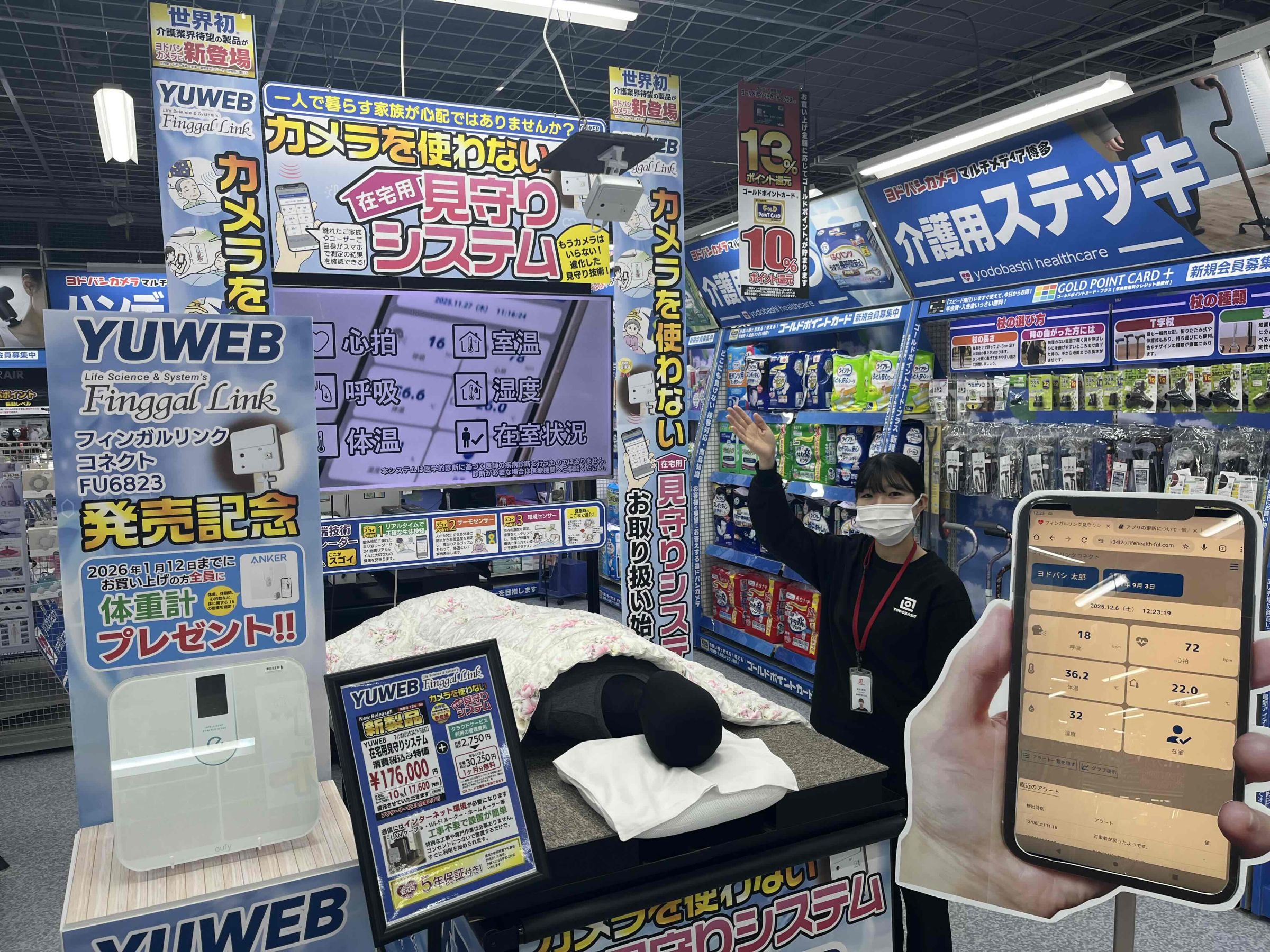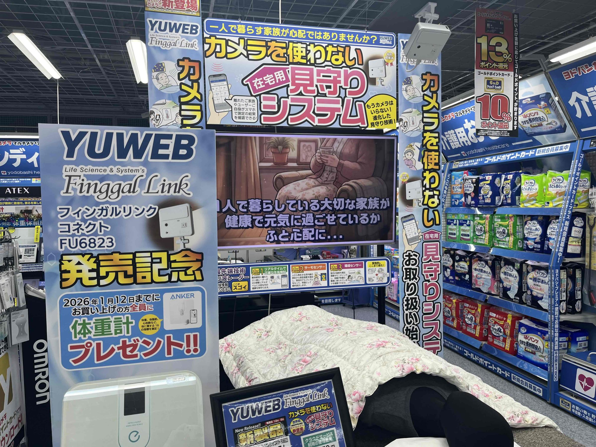ヨドバシカメラマルチメディア博多1階理美容コーナー(介護用品コーナー)から、株式会社ユーウェブから発売の在宅用見守りシステム「フィンガルリンクコネクト」のご紹介です。