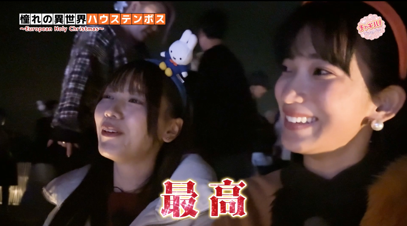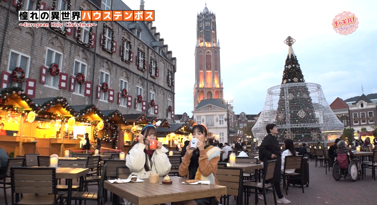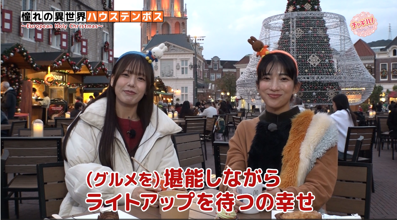 夜のライトアップイベントが始まるまで、クリスマスマーケットで食事を楽しむことにしたAYAKAとまりな。