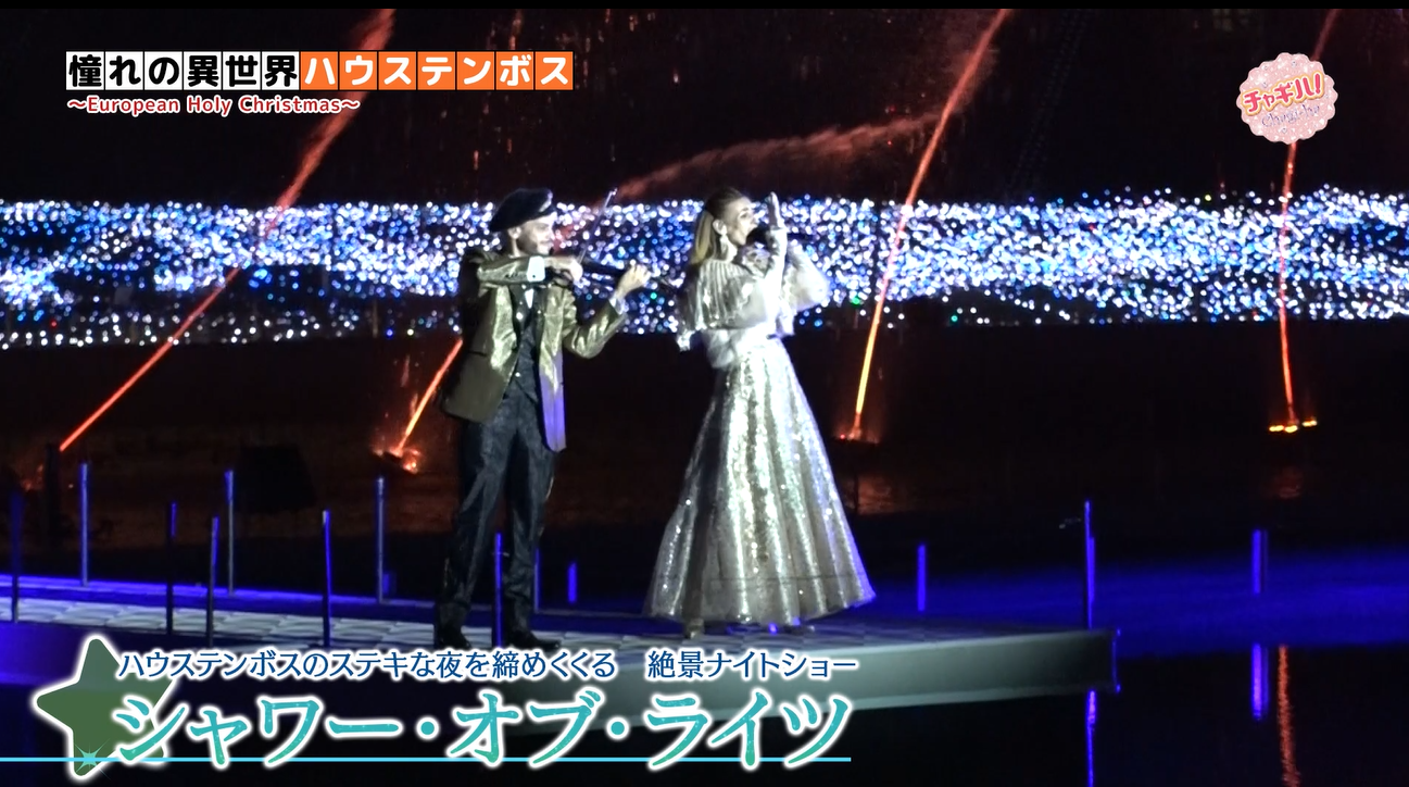 そして、ハウステンボスの夜を締めくくるのが「シャワー・オブ・ライツ」です。光と花火と噴水の絶景エンターテインメントショーで、アーティストによる生歌と生演奏がドラマチックに演出します。