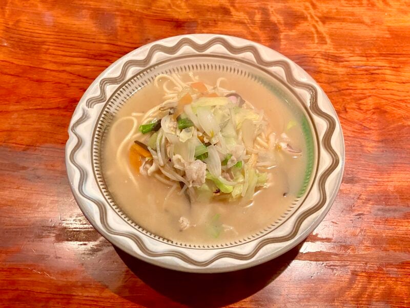 程なくもうもうとした湯気を上げながら出てきたちゃんぽんは、丼ではなく小石原焼の深皿で提供されます。厨房にオーダーを通すとき、ちゃんぽんを「一杯」ではなく「一枚」と呼んでいるのも、老舗ならではの味があります。