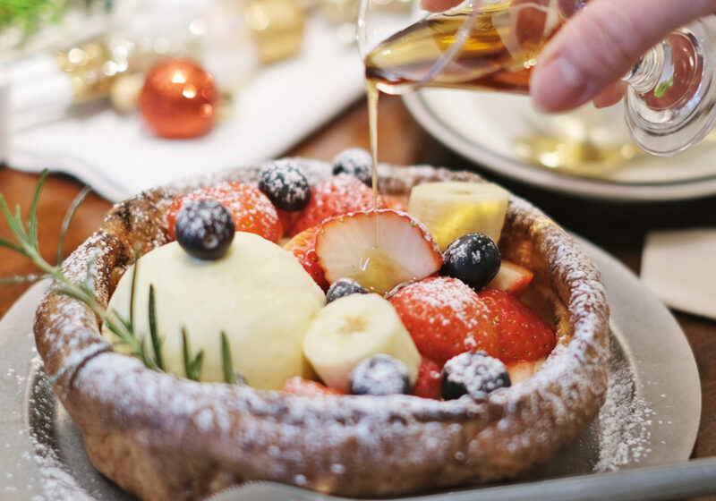 注文を受けて焼き上げるので、焼き立てアツアツ。外側はカリッと内側はもっちりとした香ばしいダッチベイビーとまろやかなバニラアイス、甘酸っぱいベリーを一緒に食べれば至福の味わいが広がります。添えられたメープルシロップをかけると甘みと風味がプラスされてより一層のおいしさを楽しめました。