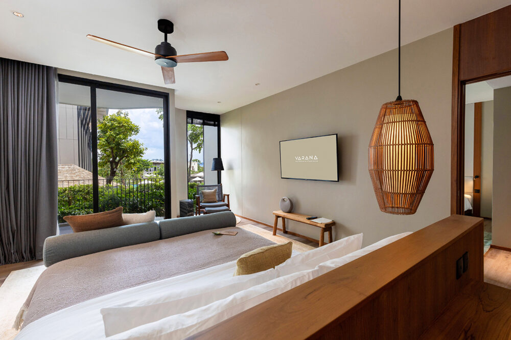 「Varana Hotel Krabi」のサステナビリティとウェルネスの哲学は客室空間においても表現されています。「ミニマリスト・エコ・ラグジュアリー」というコンセプトを元に、サイクルPETボトルから織られたラグや竹製の照明などを採用。サステナビリティをただ受け入れるだけでなく、審美的で心地よい滞在の一部としてゲストを惹きつけます。