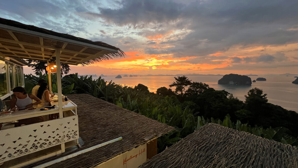 一つ目はバンカー湾を望む絶景レストラン「カオトン・ヒル」。タイ語で「黄金の丘」という意味を持つこのレストランからは、水面を黄金に染めるサンセットを眺めることができます。ちなみに美しいサンライズも見られるそうですが、その時間はお店がオープンしていないのでオーナーやスタッフだけの特別な時間なのだとか。そんなカオトン・ヒルでは、伝統的なタイ料理はもちろん、ピザやパスタといったカジュアルなメニューもラインナップ。またカフェメニューも充実していて、タイで流行っているコーヒー×フルーツのフレーバーコーヒーも味わえます。丘の上から望むクラビの島々や美しい夕陽と洗練されたカフェメニューに満足すること請け合いです。