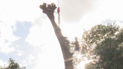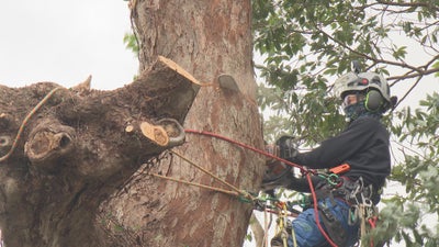 一般的な土木機械では作業が困難な場所や木を倒すスペースがない場所、斜面の立ち木や神社の巨木など、切り倒すのが難しい場所にある木を切る、「特殊伐採」。ツリークライミングやロープワークスキルを駆使し、安全かつ正確に木を切る高度な伐採技術だ。