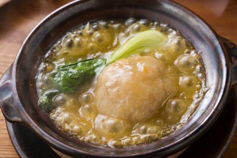 さらに、フカヒレスープ、魚の蒸し物に舌鼓を打った後、グツグツと音を立てながら運ばれてきた「獅子頭のツガニ餡かけ」。ふわふわの肉団子にカニ肉入りの餡がさらりと絡み、ボリュームはありますが、するりと入る一皿です。