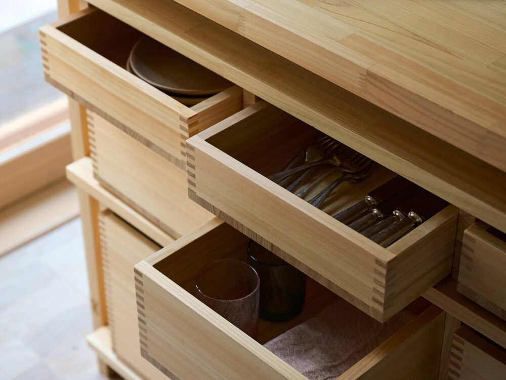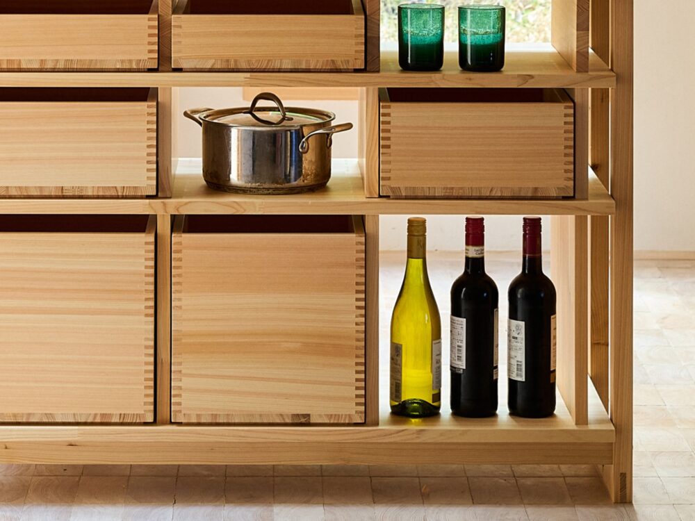 使う人の動きやすさや収納力、日常の使い勝手を大切にしたサイズ設計を行い製造の現実性や材料の入手性、セルフ組み立てを前提とした構造まで総合的に検討して開発されました。内部の構造や木材のつなぎ方、表面の仕上がりに至るまで細部を見直し丁寧な検証が重ねられています。仕上げには、木が自然に呼吸しながら守られることを意識した塗装を採用。耐久性と防汚性を備えつつ、無垢材ならではの温かみや表情が引き出されました。素材にはヒノキが使用されています。美しい木目と香りに加え、湿気の多いキッチン環境に適した特性を持ち、持続可能な林業への貢献につながる点もヒノキの選定理由にあります。