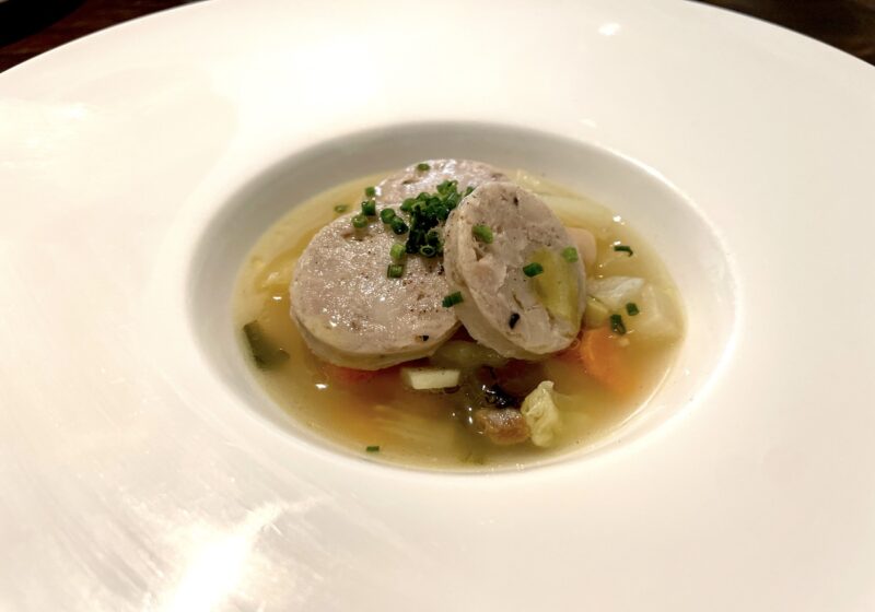 テリーヌは糸島豚を使った「パテドカンパーニュ」と、豚のほほ肉・豚耳・豚舌・豚足を使った「フロマージュドテッド」。「パテドカンパーニュ」は谷本シェフがフランス料理を目指すきっかけとなった思い入れのある料理だけに美味しさはひと際。素朴さの中に肉と脂の旨み、スパイスの香りが重なりあった力強い美味しさにワインが進みます。また、初めていただいた「フロマージュドテッド」も各部位の食感が楽しく、ハーブと玉ねぎのソースともいいマリアージュでした。