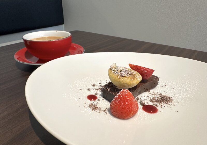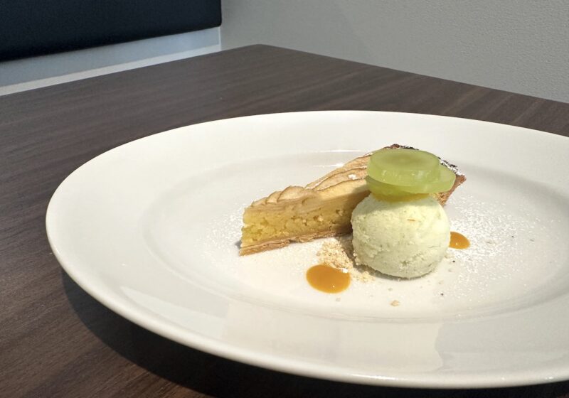 デセールも7種類からチョイス可能。今回は2名で訪問したので「テリーヌショコラとピスタチオのブリュレ」と「リンゴのタルト」をオーダーしました。濃厚なテリーヌショコラはコーヒー(250円でオーダー可)との組み合わせが最高でした。一方、「リンゴのタルト」には青リンゴのソルベとシャインマスカットを添えて。メイン料理の余韻が残る口の中を、爽やかな酸味とみずみずしさで心地よくリセットしてくれました。