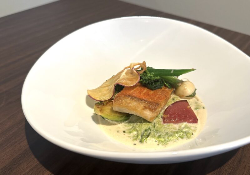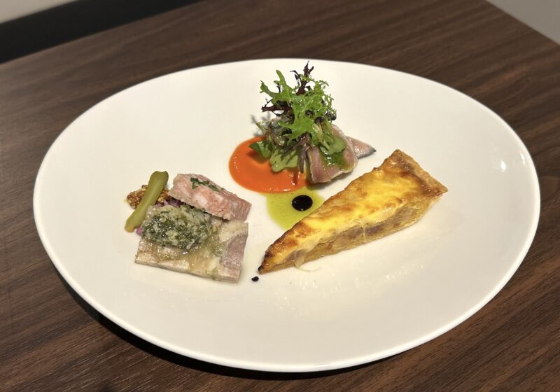 次に登場したのが「本日の前菜盛り合わせ」。「自家製ベーコンと淡路島甘玉ネギ、グリュイエールチーズのキッシュ」「ハガツオの炙り 焼き茄子のタルタル」「テリーヌ2種」です。キッシュは玉ねぎの自然の甘さが引き立ち、白ワインとも相性抜群。魚はバジルとハーブのソースに加え、色鮮やかなパプリカソースも敷かれ、素材の美味しさをソースでしっかりと引き出すフランス料理らしいテクニックが光ります。
