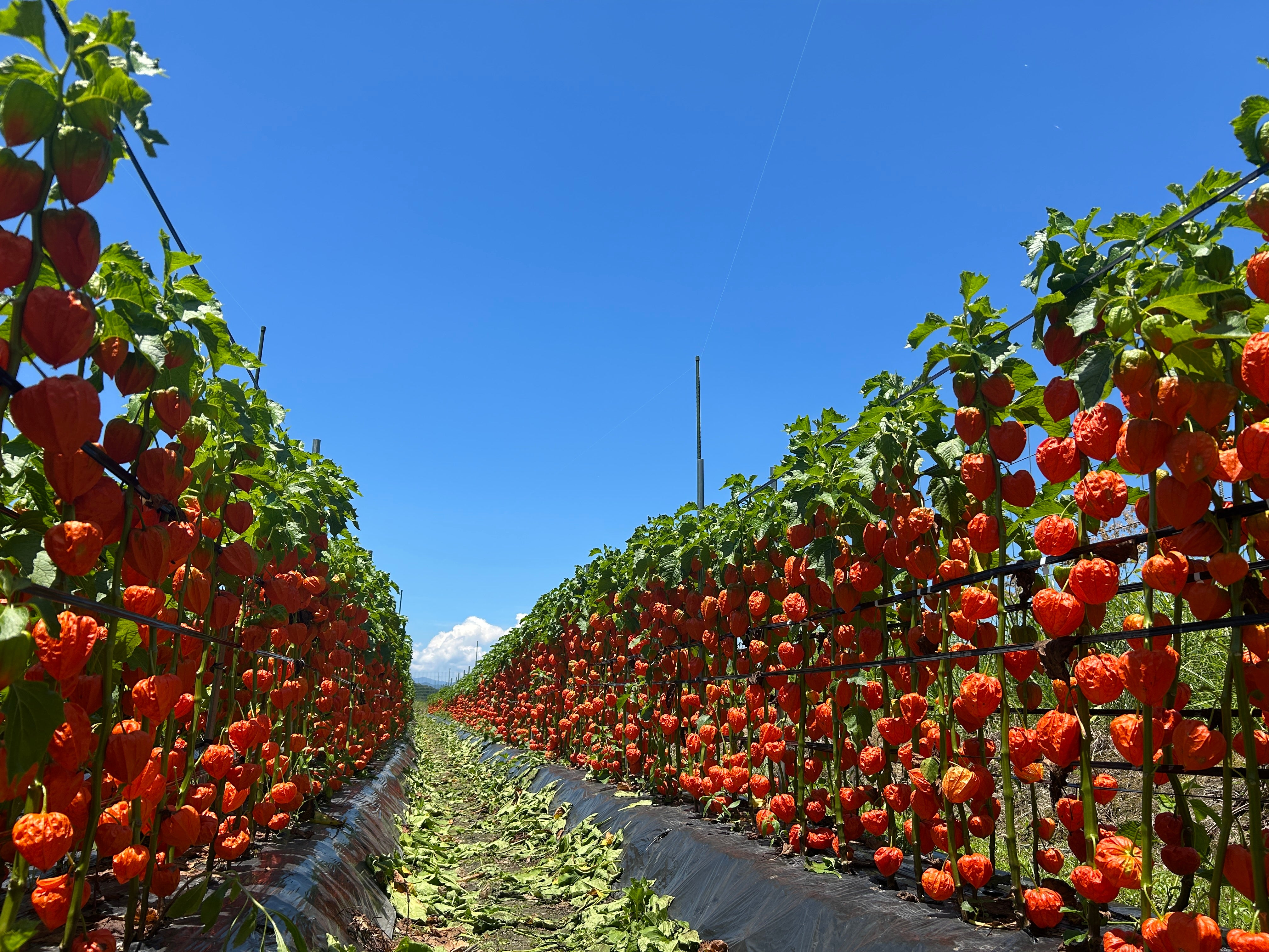 去年は45,000本定植して32,000本出荷。全国的に見ても、露地栽培のほおずきをこれだけの本数出荷している農家さんはいないそうです。畑に苗を定植させて1本1本支柱を立てていくのも、1本1本手丁寧に消毒するのも、収穫するのも全て手作業。想像しただけでも気が遠くなります…