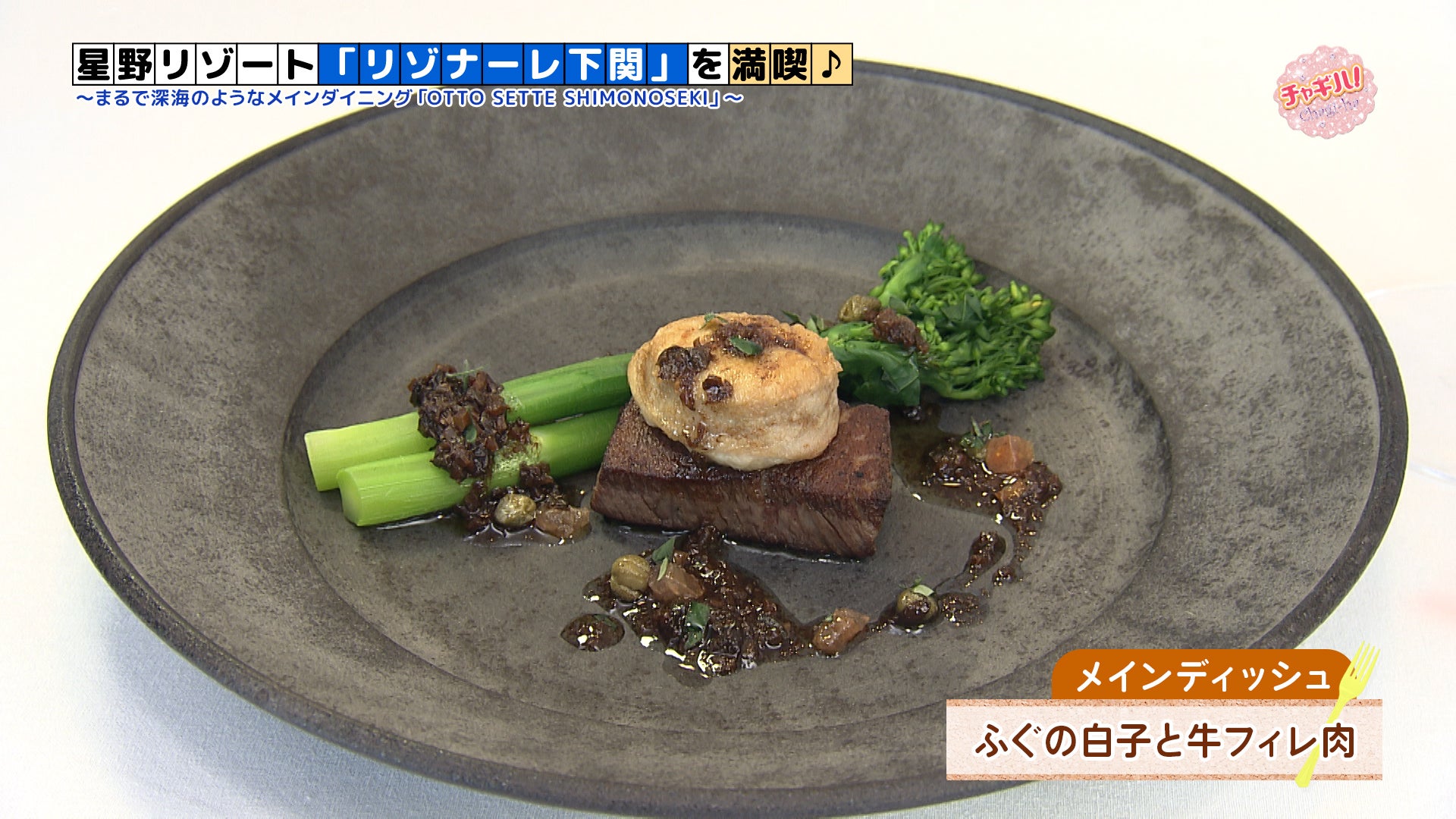 厚みによって変化するフグの味わいや素材本来の味を楽しめる全9品のコースメニュー。メインディッシュは牛フィレ肉に白子のムニエルをのせたロッシーニ風。アンチョビとケッパー、エシャロットを加えた焦がしバターソースは、フグにもフィレにもよく合います。