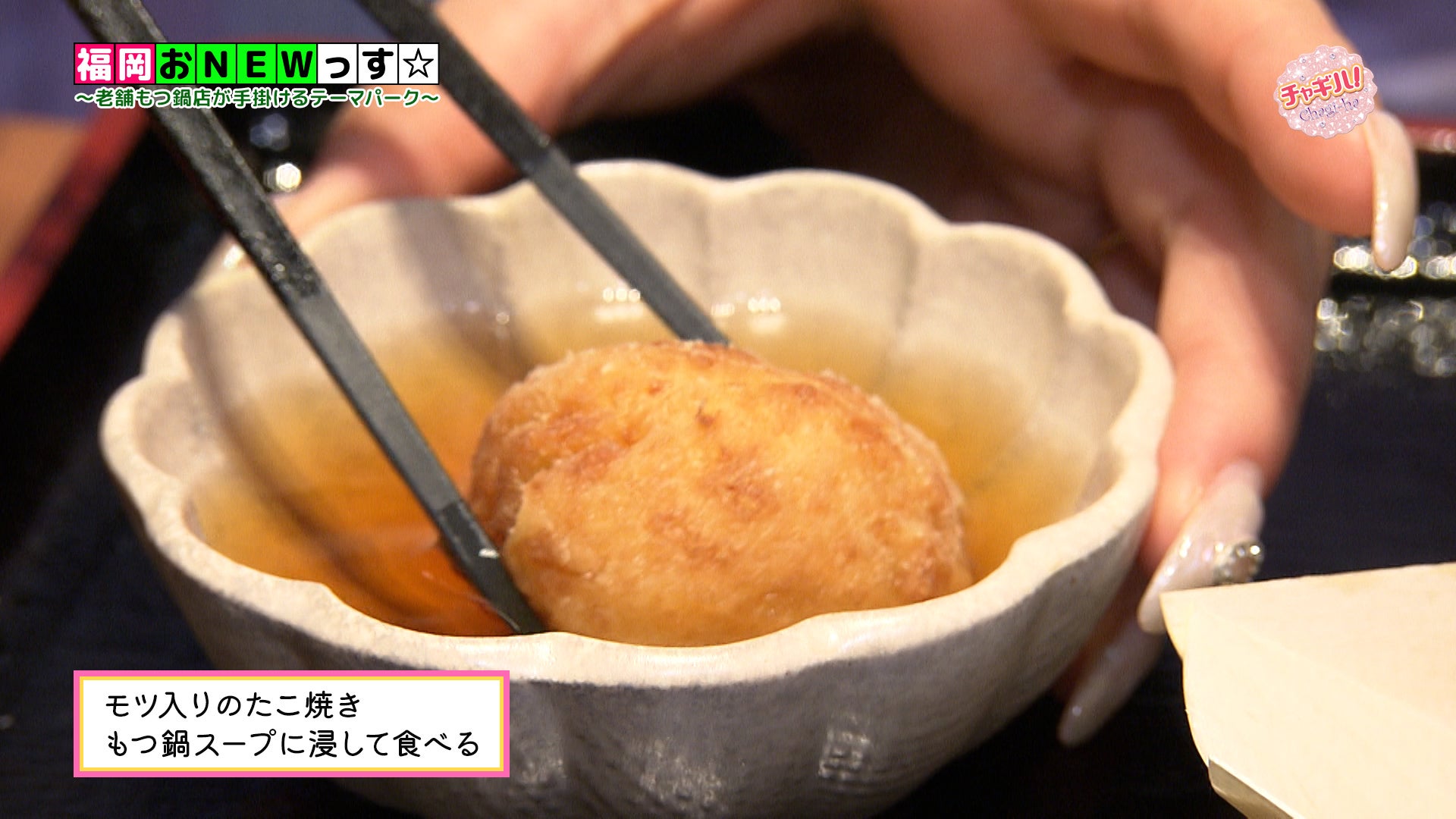 トロトロの生地にもつが入った“たこ焼き”をもつ鍋のスープに浸して食べる「博多もつたこ焼き」も人気です。