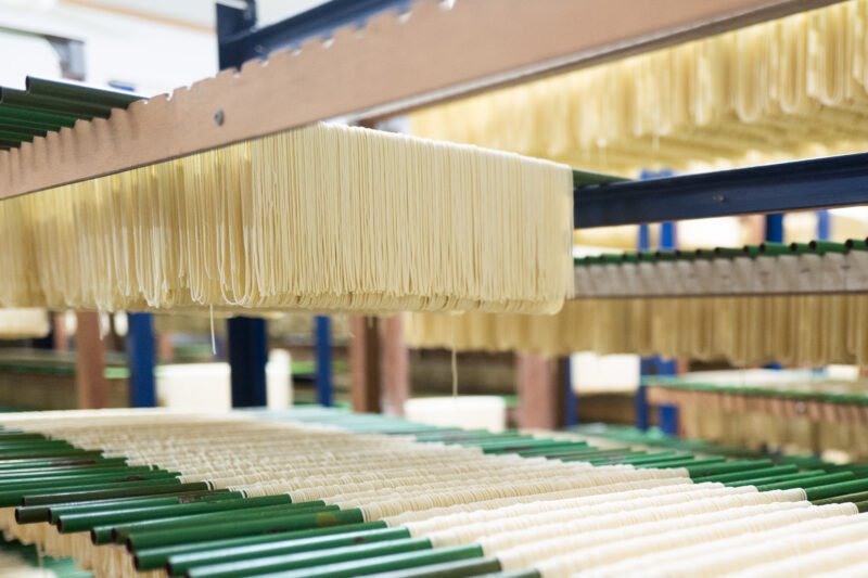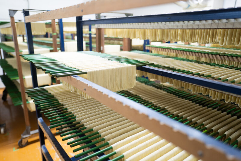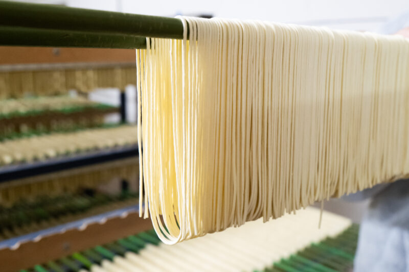 もちろん、無化調のスープだけではラーメンにはならない。麺があってこその一杯だ。ただ、その麺においては、長年積み上げてきた実績と、独自の手法がある。「鳥志商店」では、そうめんづくりに端を発する乾麺づくりが土台。まずその日の天候に合わせ、職人たちが乾麺づくりの要となる乾燥室で温度と湿度を確認する。この乾燥室で実に3日かけて熟成と乾燥を同時に進めていく。特筆すべきはその干し方。麺を干す際、アルファベットの「M」の形にして干すのだ。