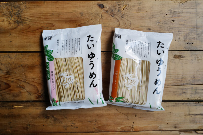 目下、注目を集めているのが新シリーズの「たいゆうめん」。 “体(たい)”に“優(ゆう)”しい“麺(めん)”という意味が込められた商品で、麺からスープに至るまで、100%植物性の原料だけで製造されている。現在、「たいゆうめん」には「塩×ゆず」「醤油×生姜」「味噌×ごま」の3種をラインナップ。麺においても福岡県産小麦のラー麦にこんにゃく粉を合わせた特製仕様となっている。