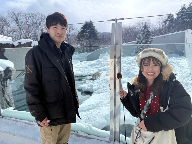この日はラジオ生中継2本立てという大仕事。極寒の中での機材準備でしたが、動物園スタッフの皆さんが「ここからだと綺麗に撮れますよ」と、とても親切に案内してくださいました。その丁寧なおもてなしに、前田の緊張もほぐれた様子。札幌の人の温かさに支えられ、北の王者の迫力を熱くリスナーにお届けできました!