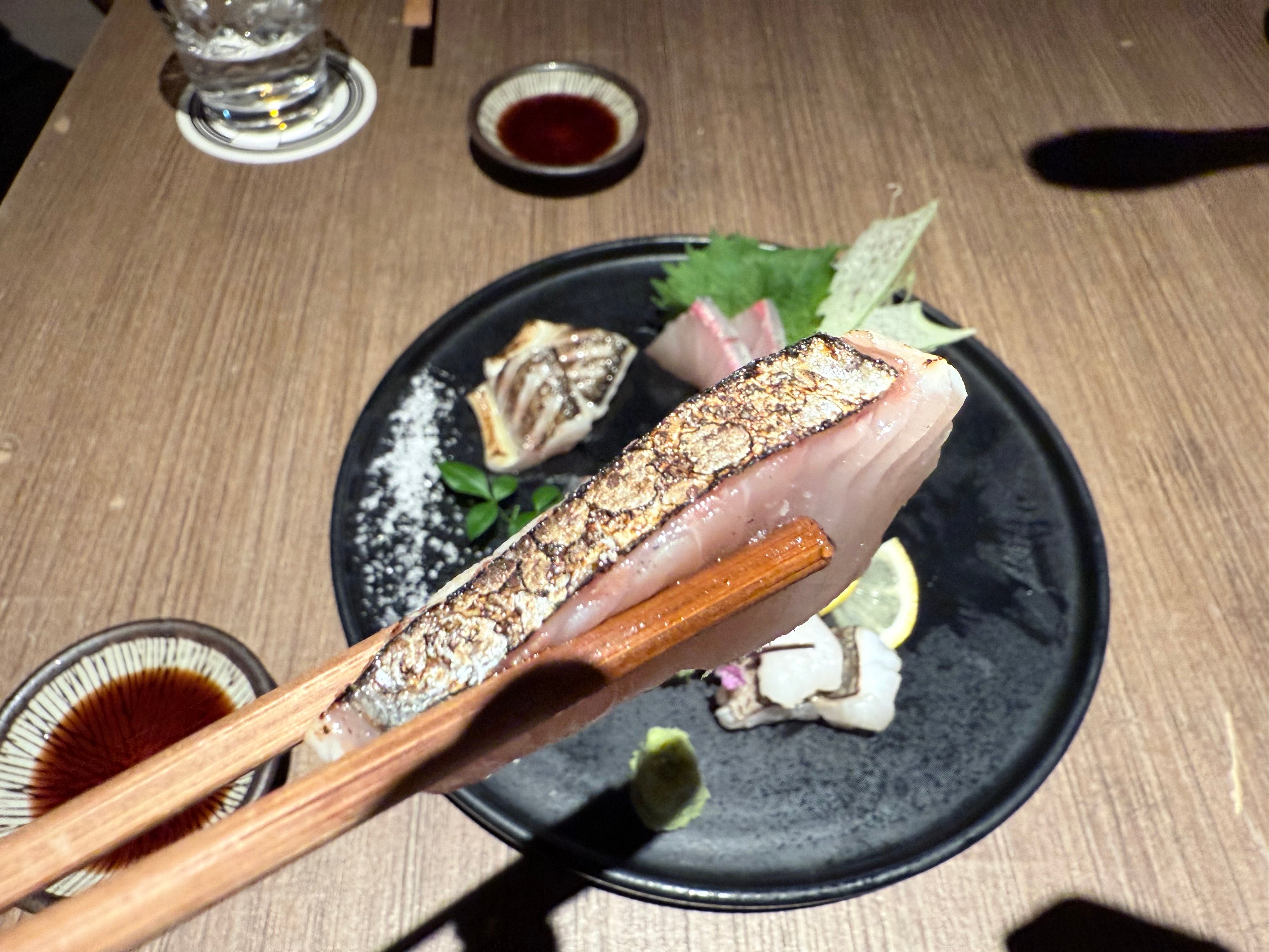 まずは「魚の盛り合わせ」 サワラの炙りはプリップリで、盛り付けはまるで日本庭園のような美しさ!
