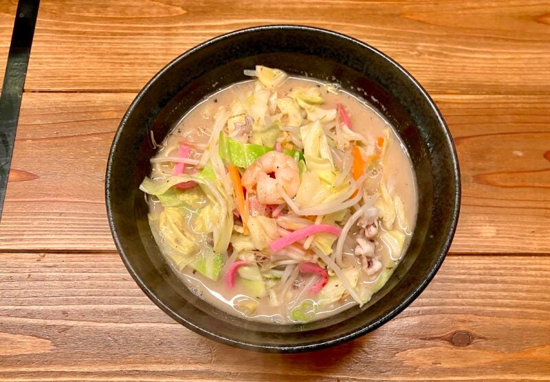 ラーメンと同じ豚骨と鶏ガラをベースにしたスープは茶褐色で、具材から染み出た旨みが凝縮されたようなパンチのある濃厚な味わいです。中太の麺はツルツルとした舌触りでスープともよく絡み、プリプリとしたエビ、シャキシャキとした野菜の食感とも相まって、全体的にバランスのとれた仕上がりとなっています。