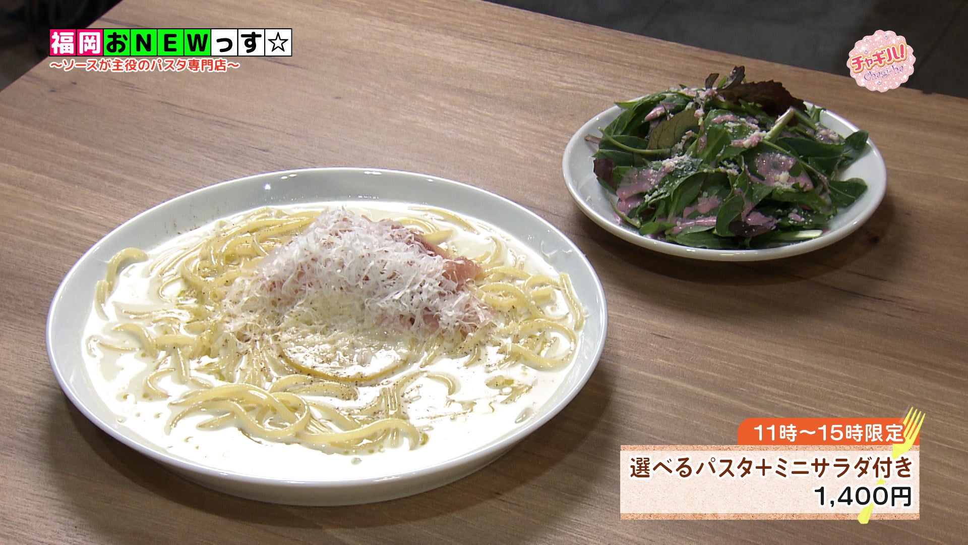 パスタは全15種類。値段はメニューによって異なりますが、ランチタイムは、ミニサラダが付いてオール1,400円♪