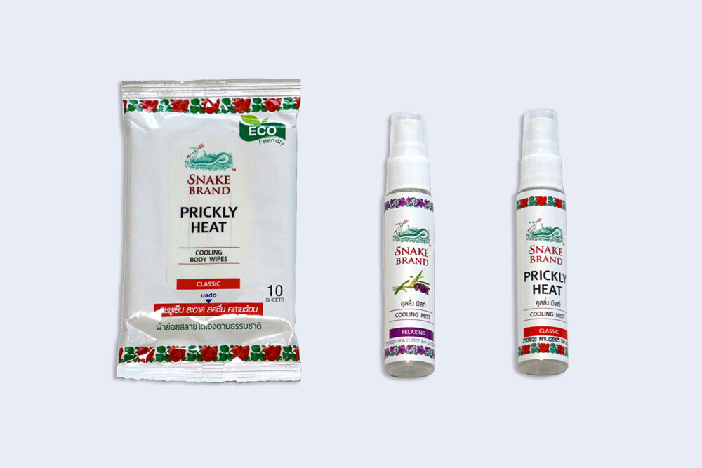 2つ目は「スネークブランド」の「プリックリーヒートクーリングミスト」&「ボディシート」(右上)。常夏の国・タイで人気のこのアイテムは、汗をかいた時などの身体の不快感を除去し、冷涼感と香りをもたらしてくれます。元々はクーリングパウダー(粉)だったものが、携帯しやすいミストタイプとボディーシートタイプで展開。