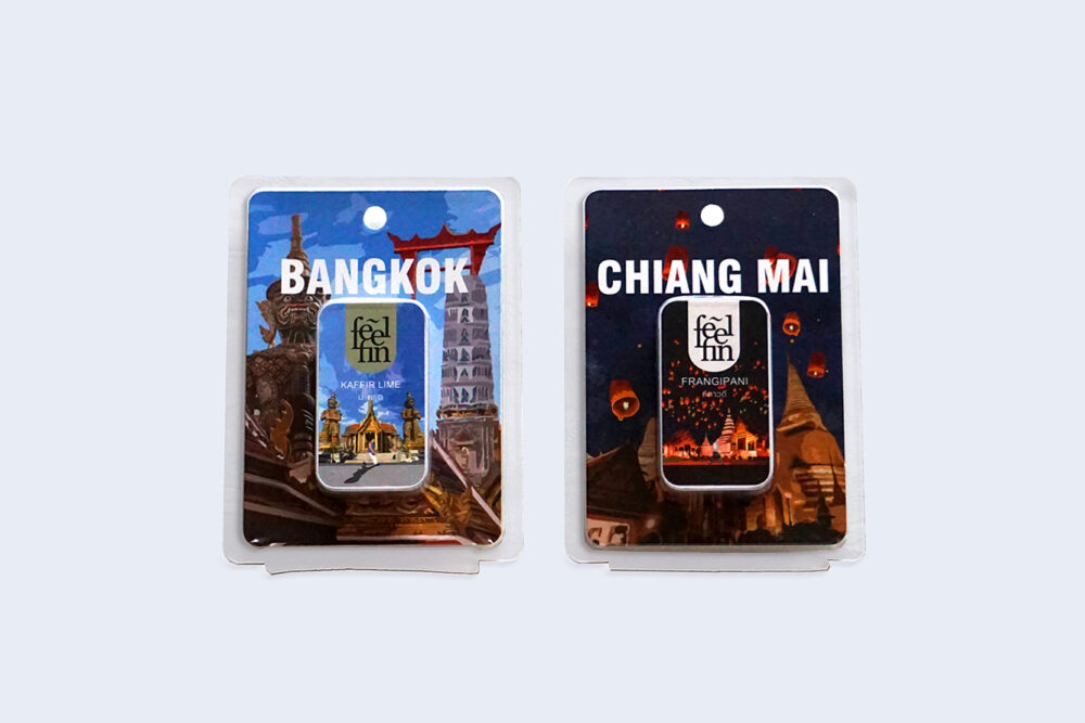 最後は清涼感のある香りをはじめ、さまざまな香りが選べるアロマティックバーム「フィールフィン」(右下)。パッケージにバンコクやチェンマイといったタイの名所が描かれているので、お土産にピッタリです。