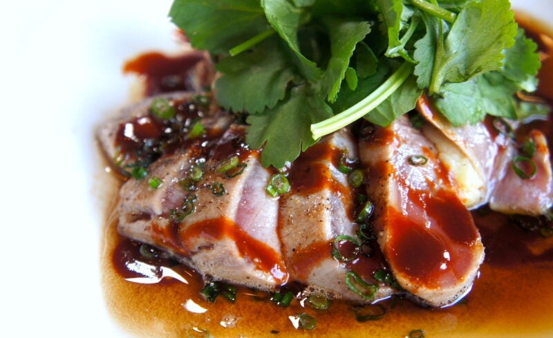 メインに選んだのは「マグロのペッパーソテー 焦がしバターソース」(2,100円)です。半レアに焼かれたマグロはしっとり濃厚な味わいで、そこにバターの香り豊かなソースが優しく纏います。パクチーも合わせて食べると、まさに和と洋とアジアのフュージョンです。