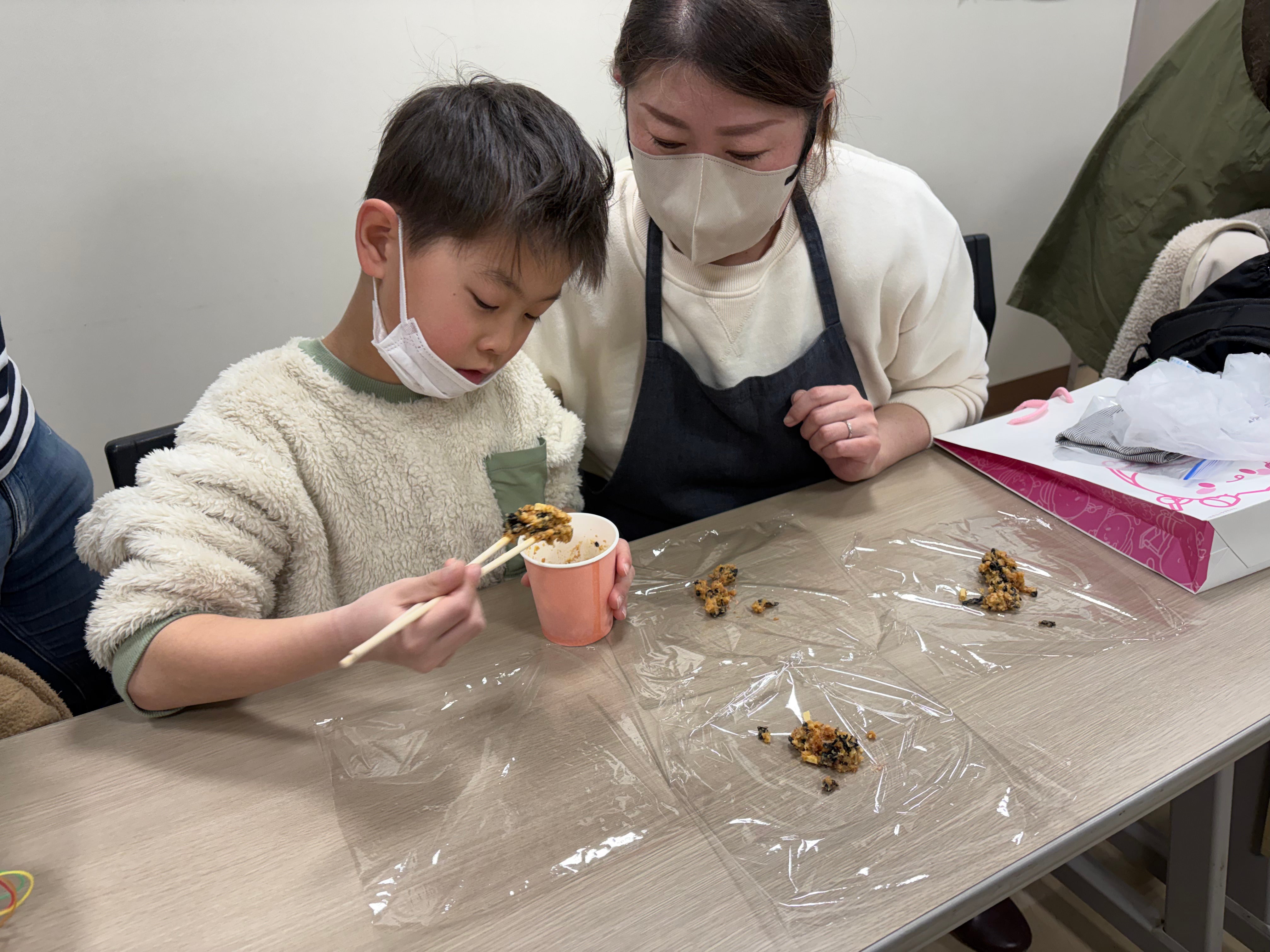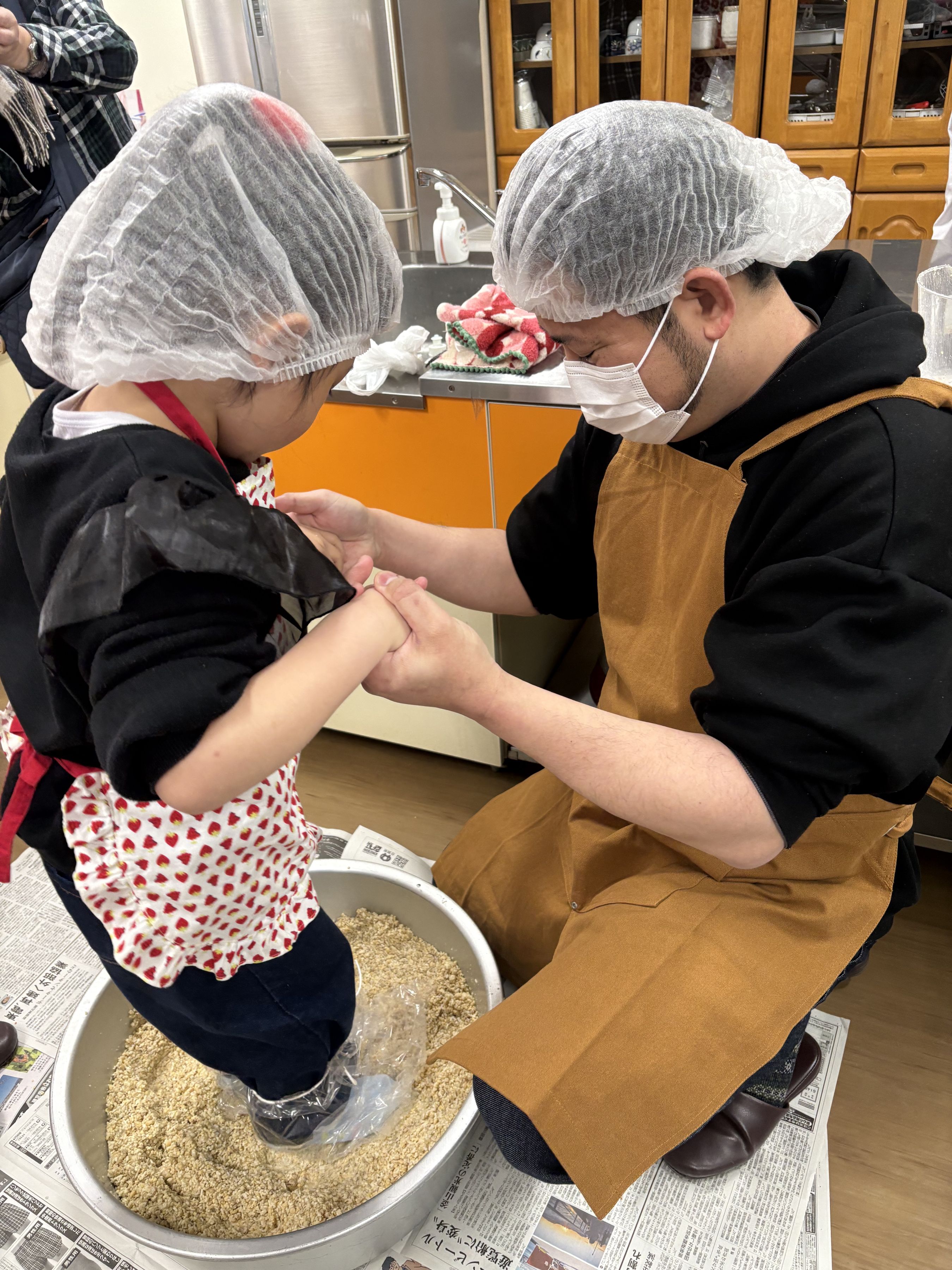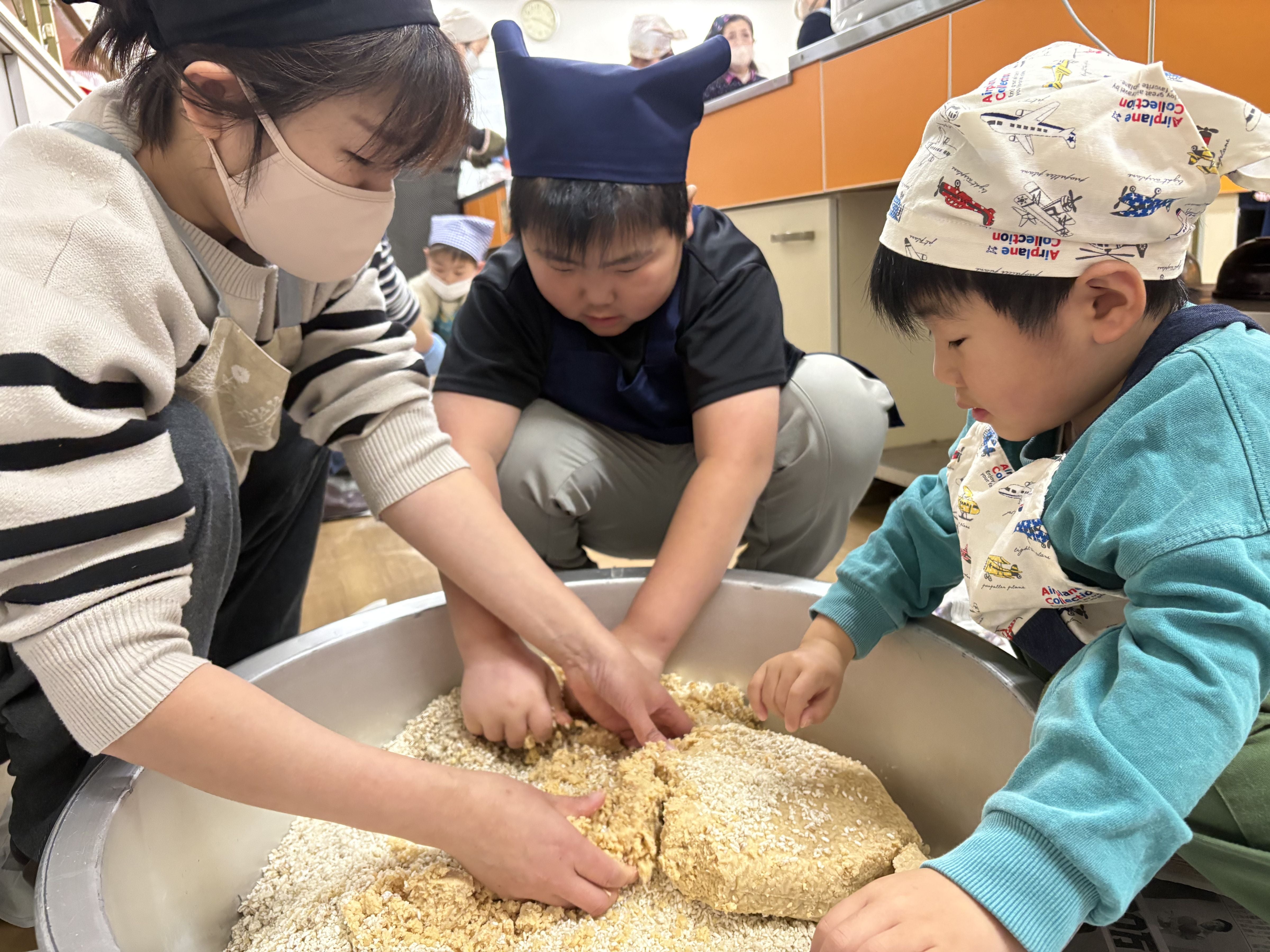 初参加のご家族は、この大豆と麹がどのように変化して味噌になっていくのかが楽しみ♪と期待に胸を膨らませて混ぜ合わせていました。