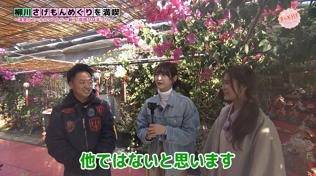 南国を感じる色鮮やかなブーゲンビリアに囲まれたひな飾りは、他では味わえません。