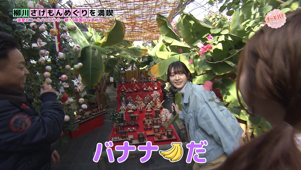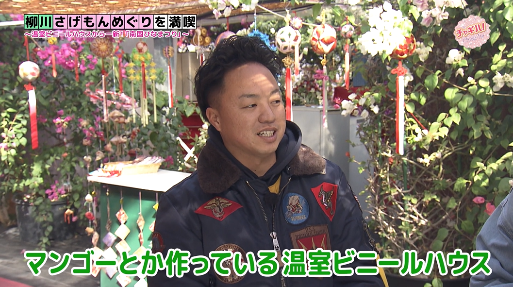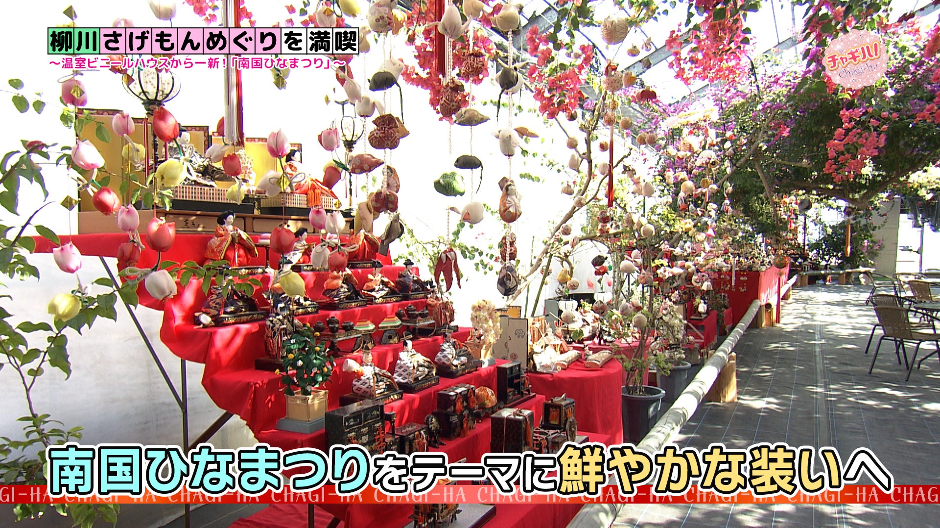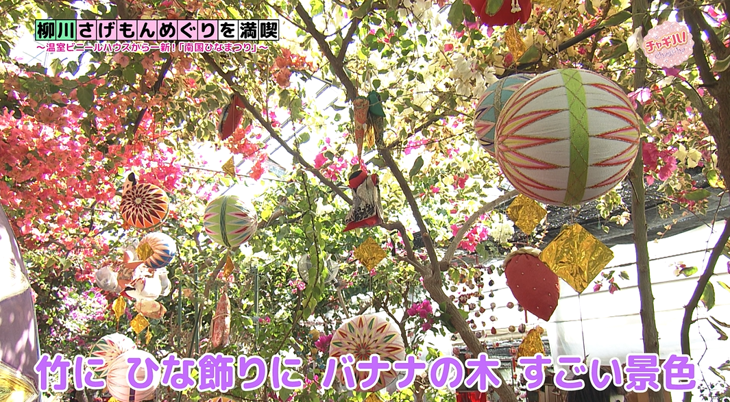 普段はマンゴーやバナナなど南国フルーツを栽培しているビニールハウスの中には、ひな人形や柳川伝統の吊るし雛「さげもん」などが飾り付けられています。