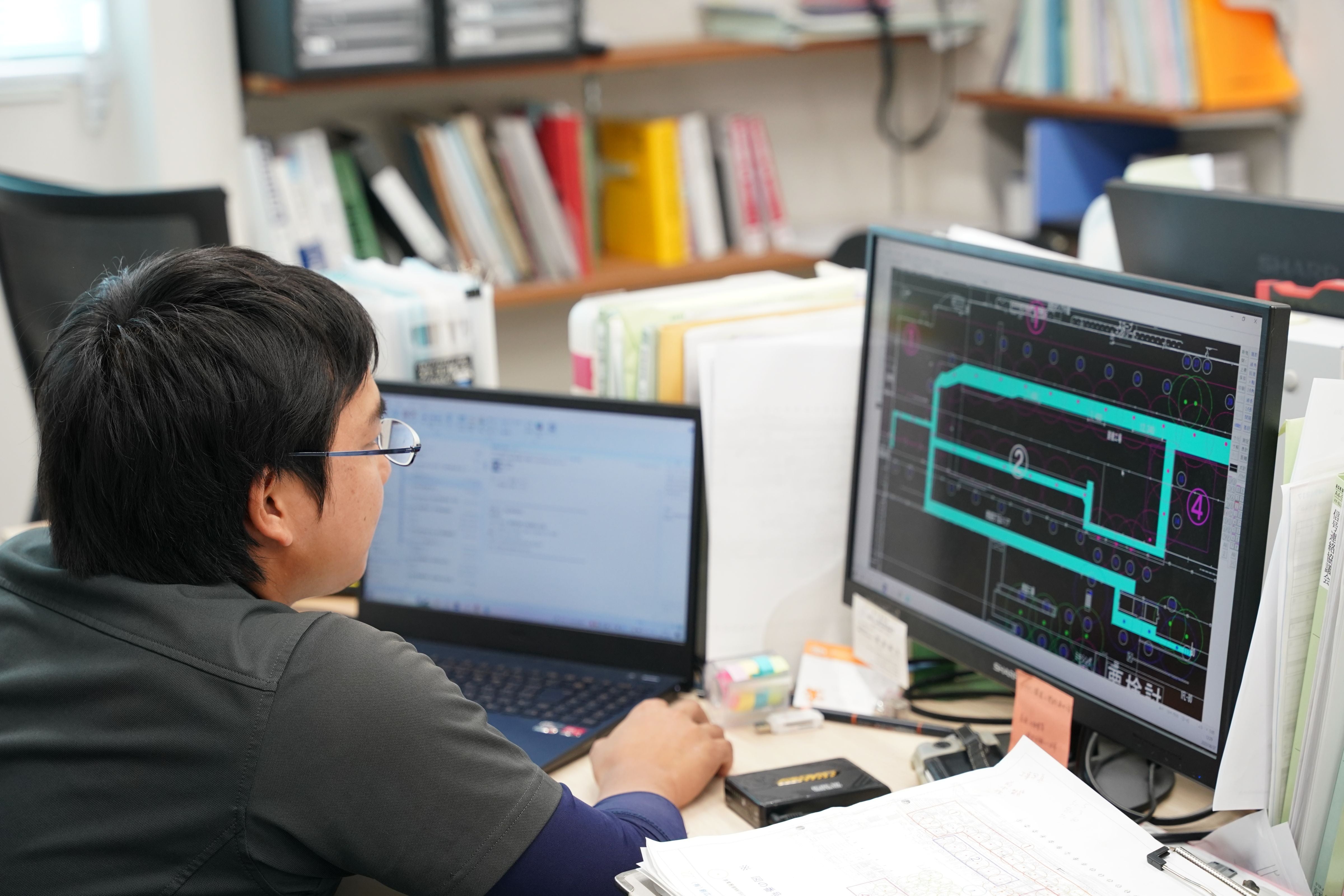 現場ごとに内容は異なりますが、図面をもとに仲間と協力しながら作業を進めます。自分たちが施工した設備に電気が通り、無事に作動した瞬間は大きな達成感があります。社会の安心と安全を支える、責任とやりがいのある仕事です。