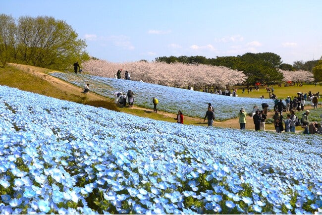期間中は100万本のネモフィラによる青い花の海をはじめとして、チューリップやバラ、アリウムなど様々な花がリレーするように咲き誇ります。さらに、週末を中心に、動物ふれあい体験やクラフト体験など家族で楽しめるイベントを多数開催するほか、春限定のスイーツも登場します。