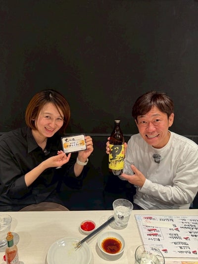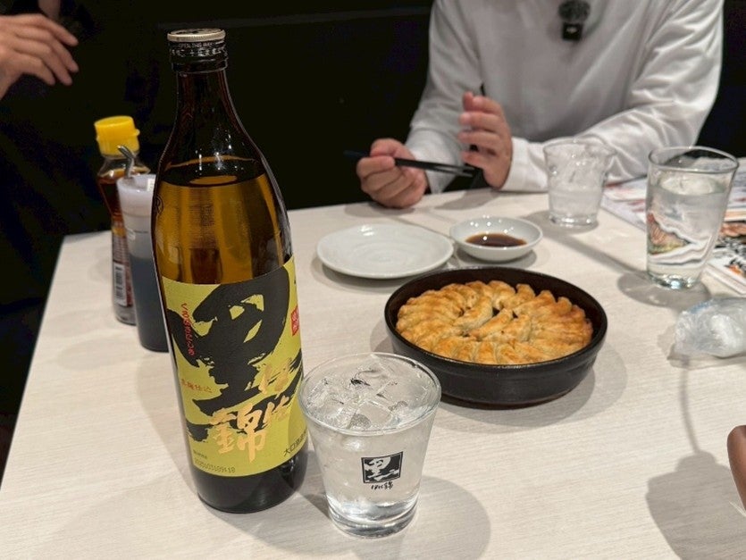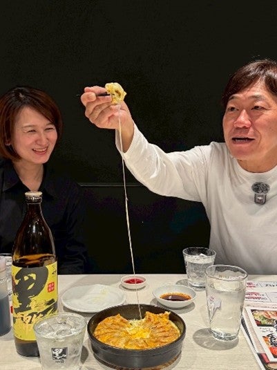 初めてのオム餃子を堪能する田中さん。もちろん、くろいさとの相性もばっちりです。