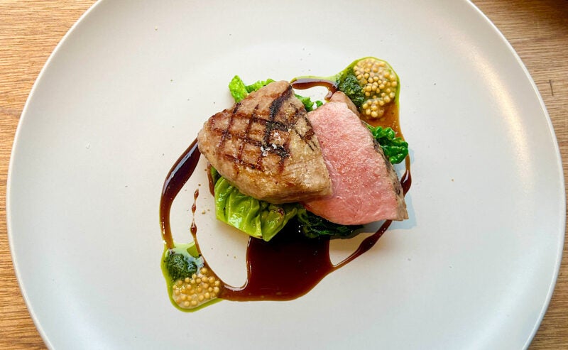 肉料理の「糸島豚のグリル」は、サーブされた瞬間に立ち上がる香ばしさが印象的。塩漬けして旨みを凝縮させた豚肉は、ぷりっとした弾力があります。バルサミコ酢のソースとハーブが香るサルサヴェルデ、そしてマスタードが豚肉に奥行きを加えます。影の立役者が、豚肉の下に敷かれたサボイキャベツ。力強い緑色と、むっちりとした食感は驚くほど!ほのかな甘みと苦みが広がる、義治さんイチオシの食材です。