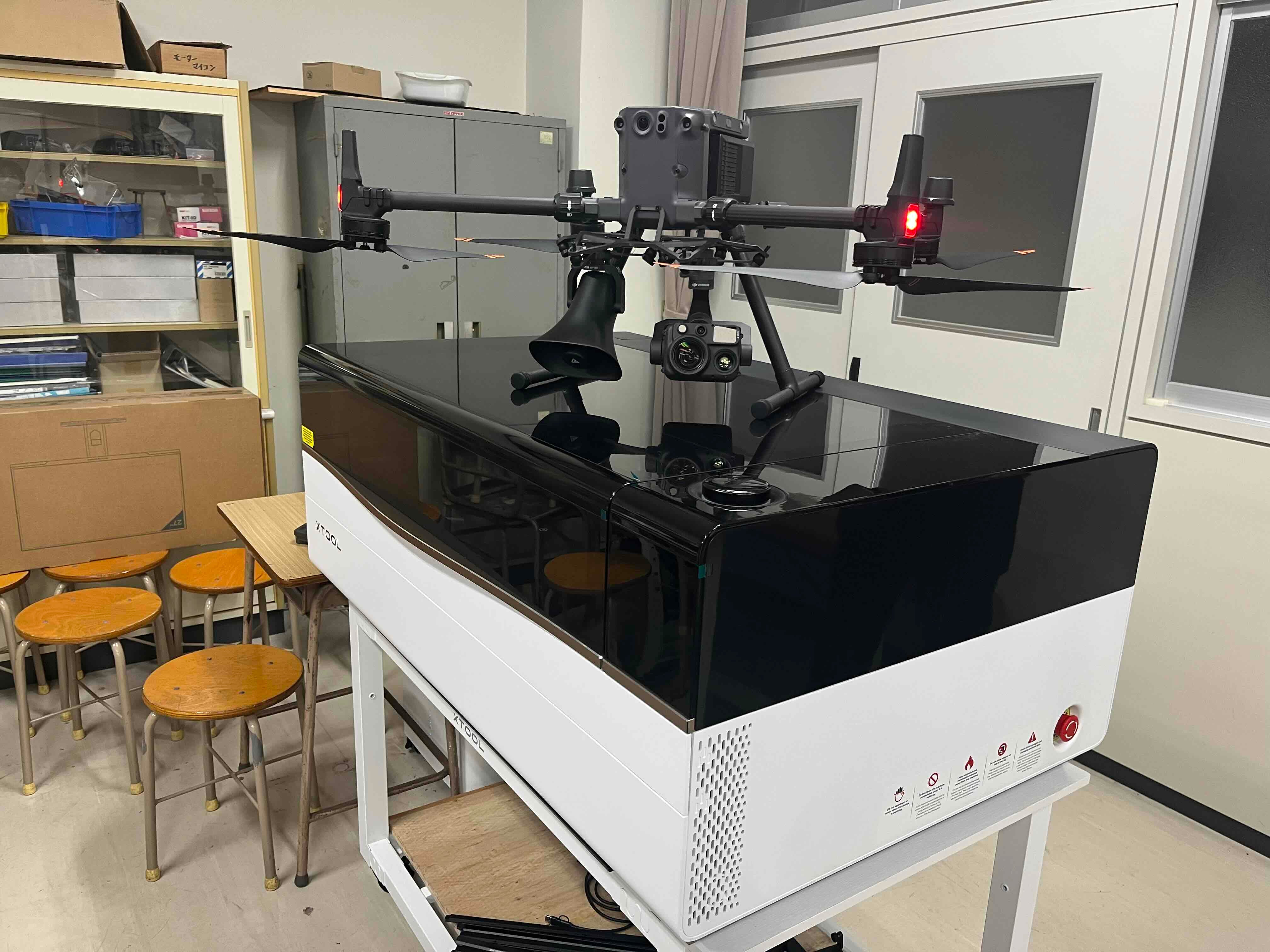 同じ教室にはドローンもあります。2人で抱えないといけないほどの大きなドローンです。課題研究では3年生が防災教育にドローンを使いました。ドローンに付いたサーマルカメラを使って教室から出る人の影を確認したり、火災の元を確認したり、ドローンが活用できるか研究をしました。ドローンには、スピーカーが付いているので、遠くで人の声が聞こえない場合、ドローンを近くに持っていき、全員にアナウンスしたり、音声や音楽を流し、非難の目印にしたりすることもできます。