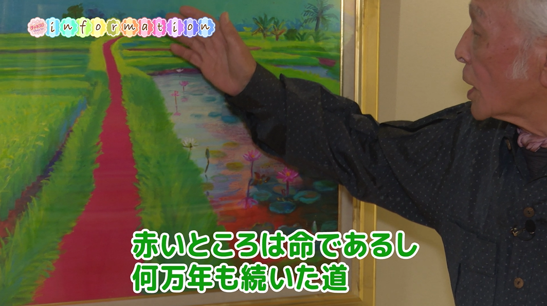 ギャラリーの名前にもなっている代表作の「赤い道」は、通い続けたバリ島で目に留まった1本の小道を赤で描いた作品で、単なる風景の描写ではなく、「自然と私たちをつなぐ命の道」「女性の産道」であると説明してくれました。