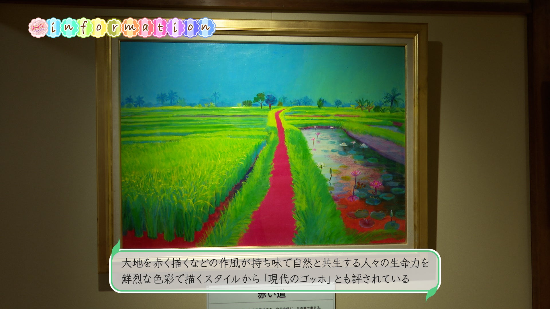 ギャラリーの名前にもなっている代表作の「赤い道」は、通い続けたバリ島で目に留まった1本の小道を赤で描いた作品で、単なる風景の描写ではなく、「自然と私たちをつなぐ命の道」「女性の産道」であると説明してくれました。