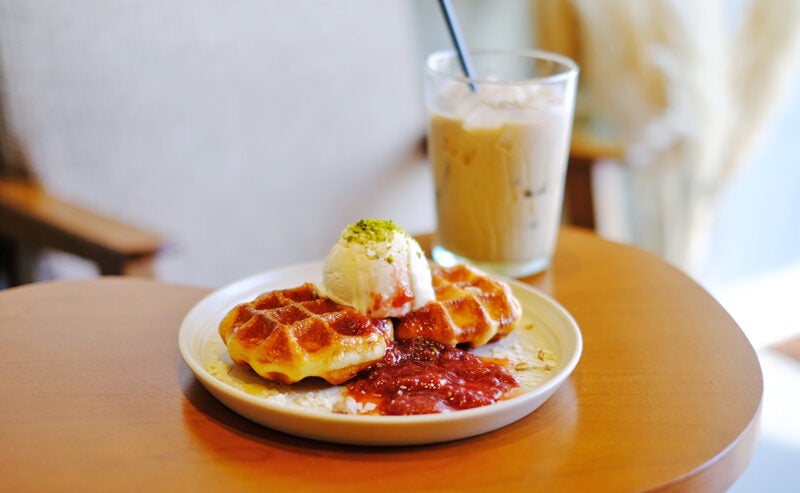 ドリンクやスイーツは、もちろん豆乳を使ったものが中心です。豆乳ドーナツなど「TOFFEE park」と共通のものもありますが、南区清水の「365WAFFLE」とコラボレーションした豆乳ワッフルは今泉限定。春限定の「ストロベリー豆乳ワッフルプレート」(1,250円)は、佐賀県鹿島市にあるラボのスタッフが収穫したイチゴで作った自家製ジャムとチーズジェラートを添えた華やかな一皿です。周りはカリッと中はふっくらしたワッフルに旬のイチゴのおいしさがたっぷり詰まったジャムやなめらかなチーズジェラートがよく合います。ホワイトチョコをかけたおからクランチが楽しいアクセントになっています。
