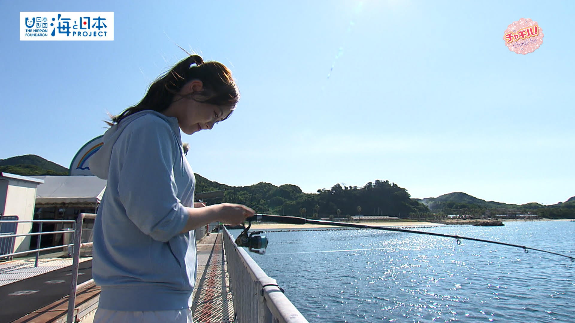 海づり公園では職員さんが初心者にも丁寧に教えてくれます。また道具も借りられるので、誰でも気軽に楽しめるんです。凜咲さんも早速、糸を垂らしてみると…