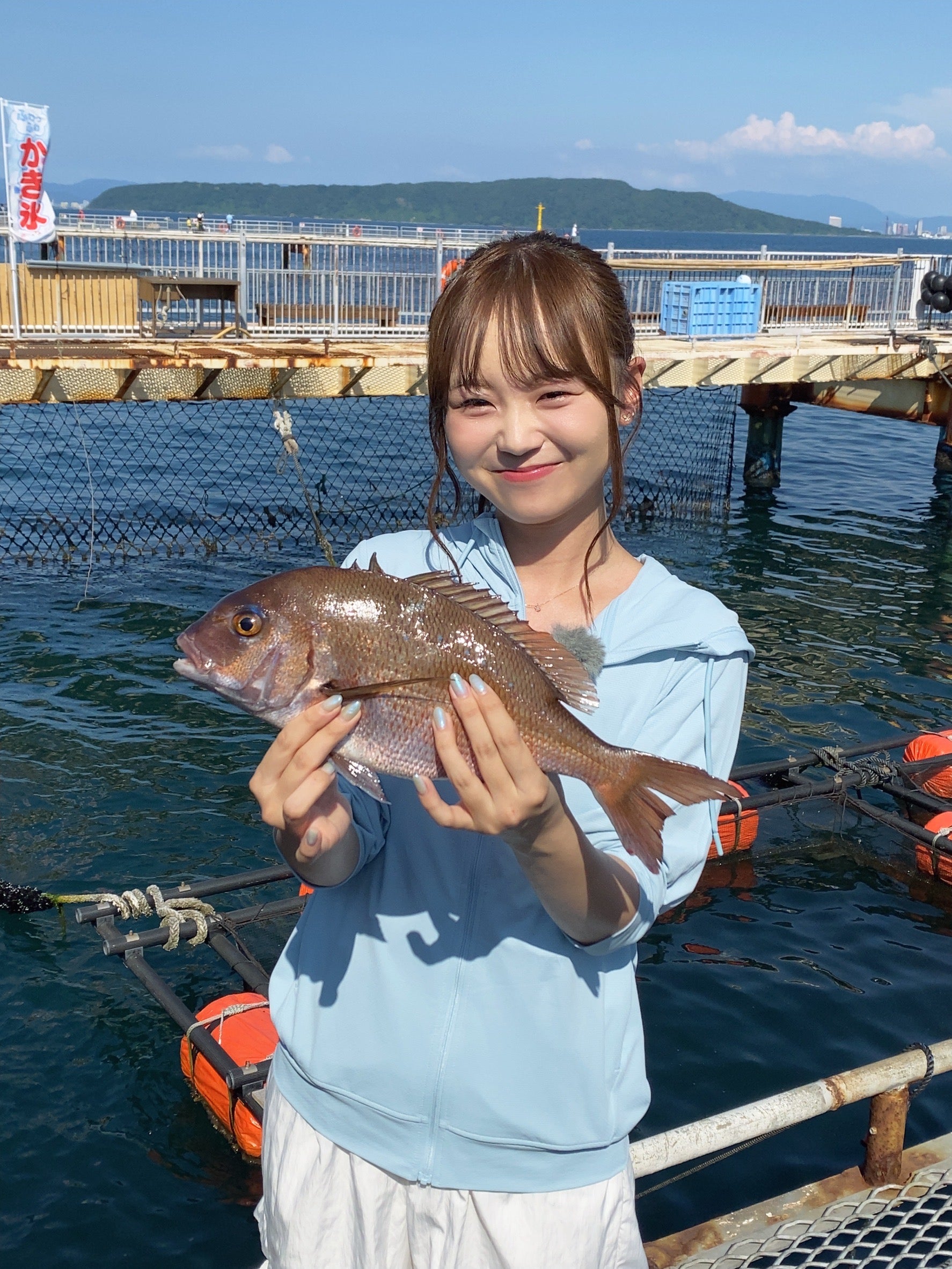 次第に釣りが楽しくなってきた凜咲さん、続いては釣り堀で鯛釣りにも挑戦!するとこちらでもあっという間に、こんなに大きな真鯛をゲットしましたー!と、今回の取材で初体験の方でも十分に釣りを楽しめるのが、海づり公園の最大の魅力であることを証明してくれた大庭凜咲さんなのでした。