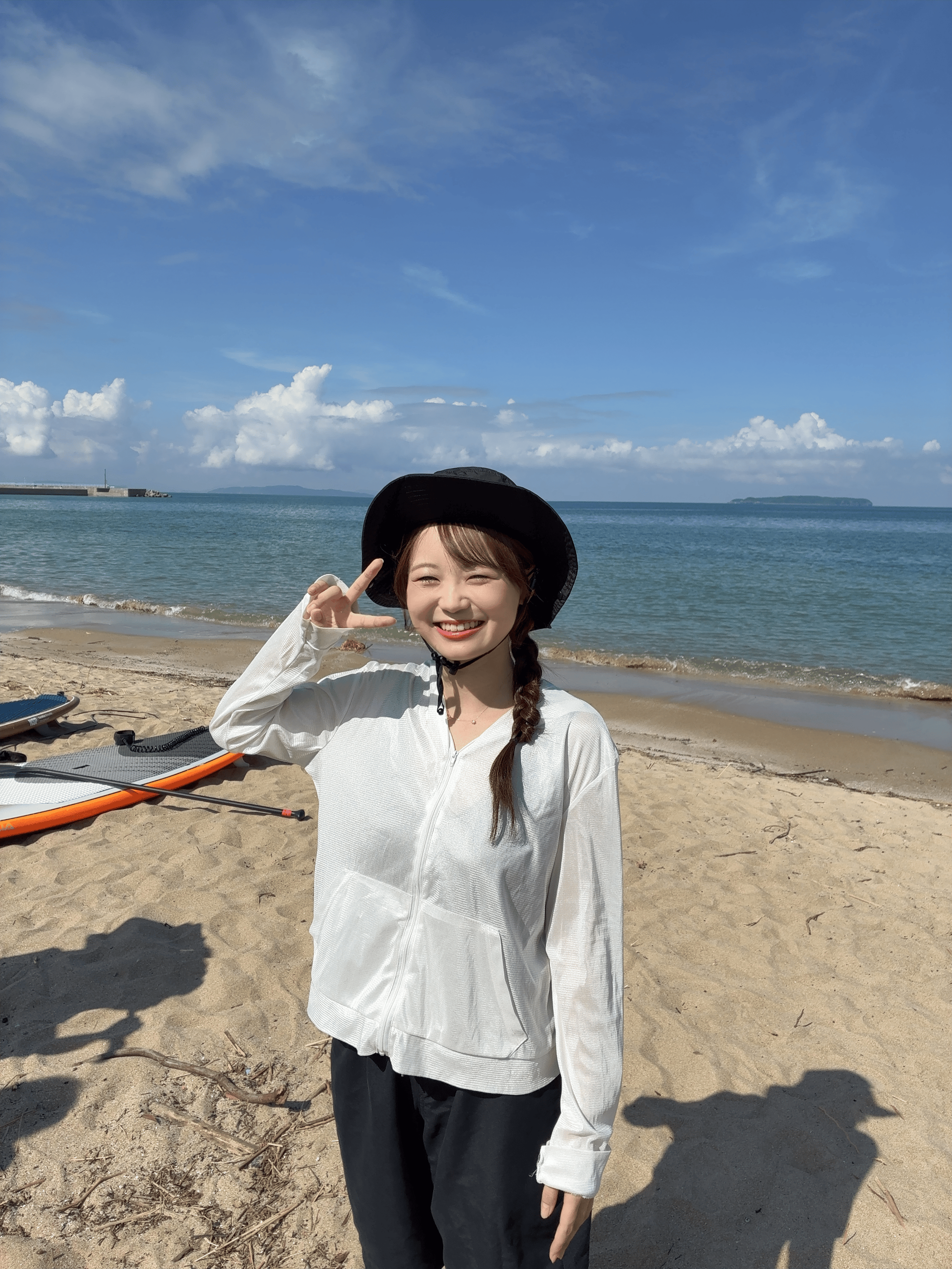 福津市・福間海岸でマリンスポーツを楽しめる人気施設・シーガルイン。そこでライフセーバ・インストラクターを務める門谷春香さんはSUPの第一人者でもあります。つまりSUPの指導者としても超一流!ならば初体験の彼女でも大丈夫だろう!ということで、前回の釣り体験に続き、再び初体験!今度はSUPにチャレンジしたのが、HKT48の大庭凜咲さん。