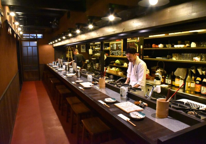 桜十字病院裏の路地に佇む「鍋ばた 新川橋」は、古民家に掲げられた「佐竹会館」の看板が目印。福岡の人気炉端「雷橋」「三光橋」などを手がける佐竹孝雄さんによる系列6店舗目で、鍋を主役に据えた新機軸の一軒です。炉端のスタイルを受け継ぎつつ、カウンターで一人前から鍋を楽しめるのが最大の特徴。気軽さと専門性を兼ね備えた使い勝手の良さが光ります。