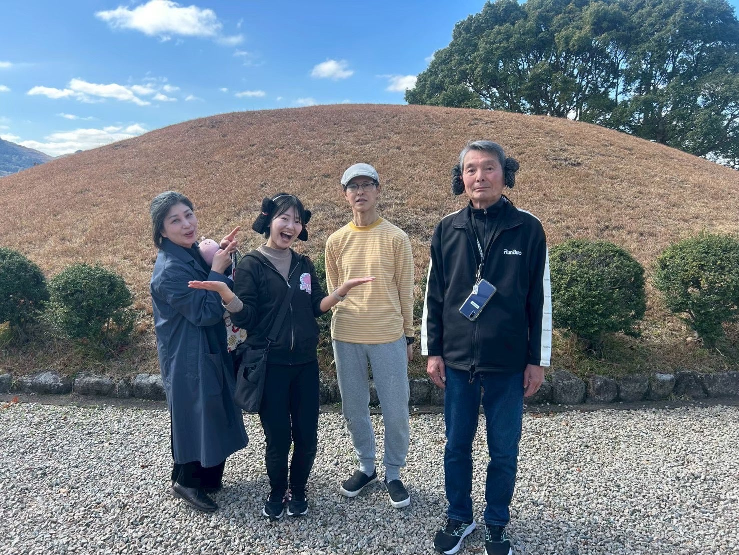 約1600年前に築かれた国指定の遺跡です。案内してくださった「志免町歴史探検サークル」の皆さんは、頭に古代のヘアスタイル“みずらヘアー”のカチューシャをつけて登場! 楽しみながら町の魅力を次世代へ伝える素敵な活動をしていました。