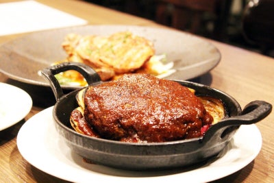 「100%ビーフハンバーグ~デミグラスソース」のハンバーグの大きさにもびっくり。濃厚なデミグラスソースと肉の旨みが口いっぱいに広がります。