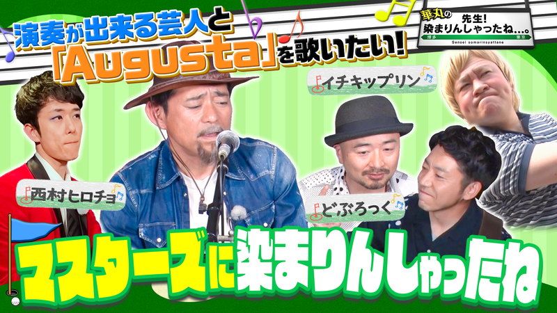 ゴルフ好きなら必ず聞いたことがある、あの大会のテーマソングを皆で「演奏」!?華丸の歌声、どぶろっくのギター&コーラス、西村ヒロチョのピアノ、さらにイチキップリン扮するスペシャルゲストの登場で完全再現を目指す!