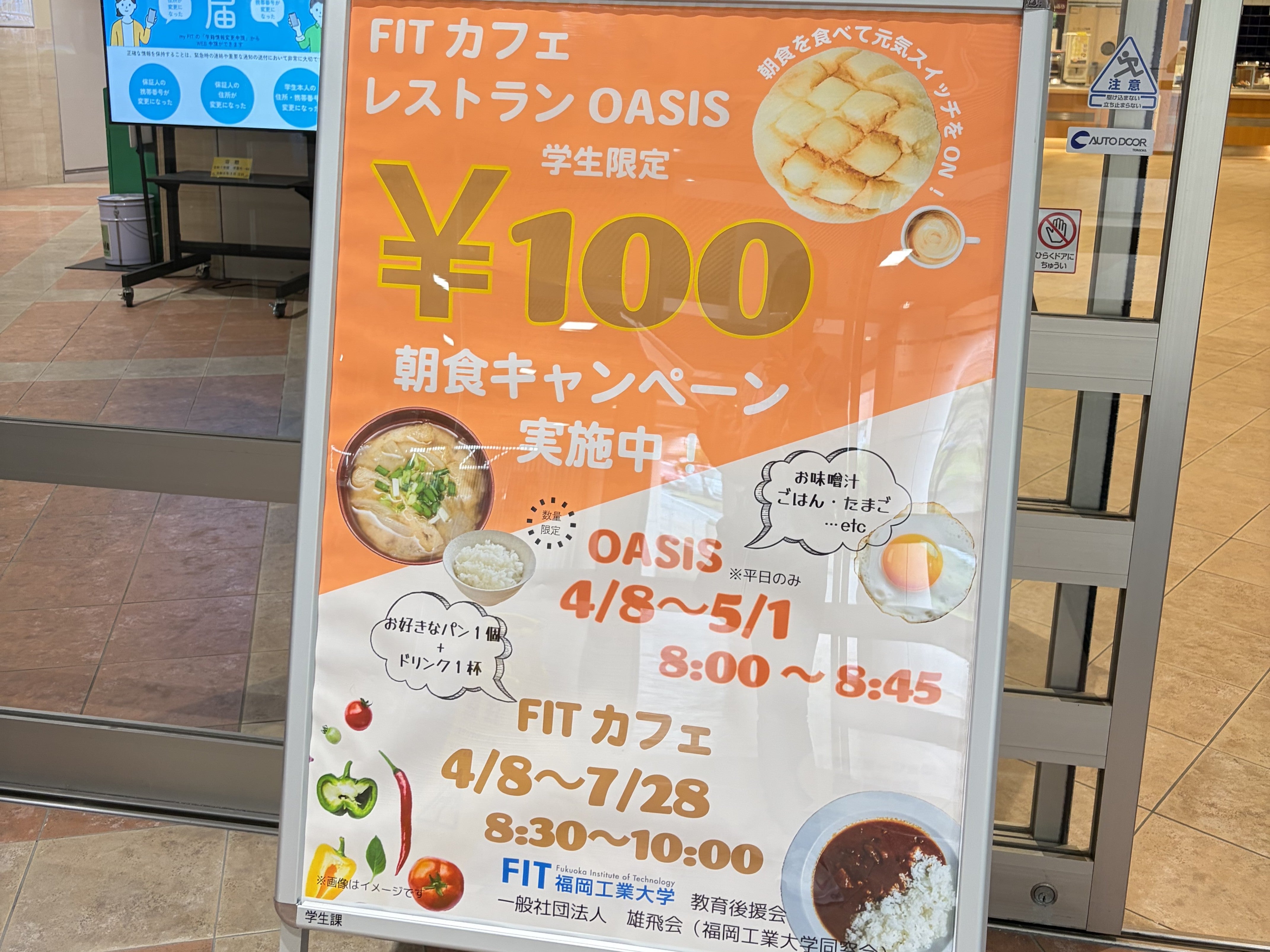 福岡工業大学の「100円朝食キャンペーン」は、学生限定で5月1日まで実施中です。心もお腹も満たされる100円の幸せ、これからもずっと続いてほしい素敵な取り組みでした。