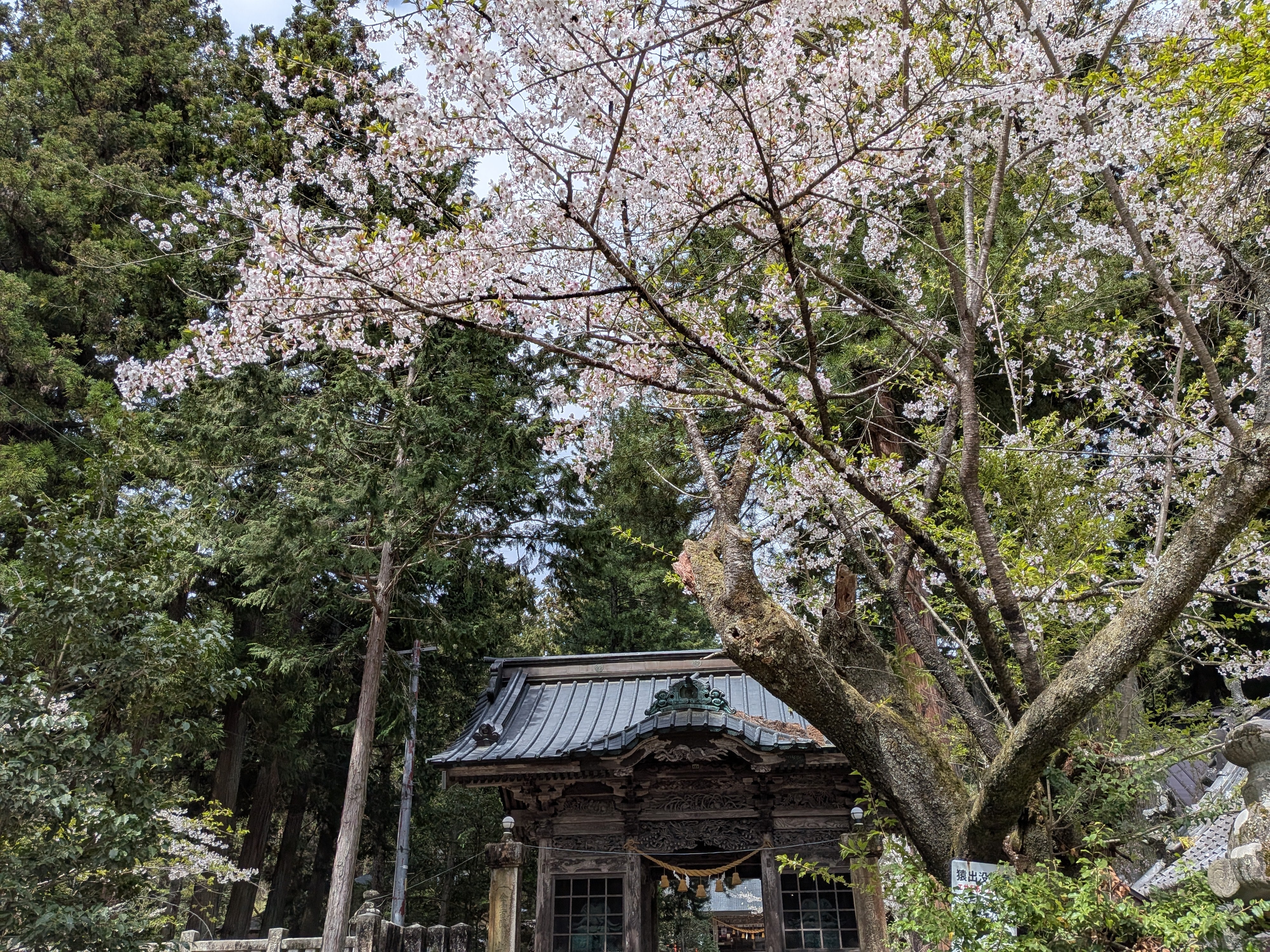 そんななか「春は安曇野…」を満喫しようとする私を、安曇野市観光課係長の稲葉裕哉さんが案内してくれたのが有明山神社(ありあけやまじんじゃ)。入り口にずらっと200本のソメイヨシノが並びます。残念ながら散り始めていましたが、はらはらと美しい桜吹雪を体験できました。
