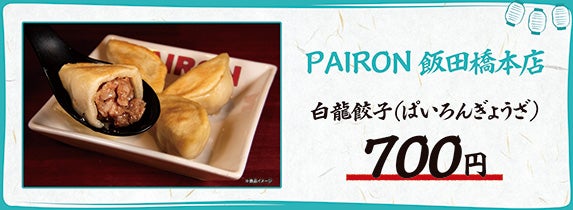 肉汁餃子のパイオニアとして、数々の番組で1位を獲得したPAIRONから、肉100%の白龍餃子、次いで人気の青龍餃子の2種を出店致します。
