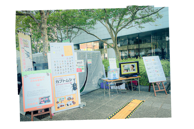 TOMUSHIさんは、福岡県大木町の特産であるキノコの栽培で出る「菌床」をエサにして、カブトムシとクワガタを育てています。これまで燃やして廃棄していた菌床を、昆虫のエサにすることで、とてもSDGsな取り組みを実現。今回のイベントではヘラクレスオオカブトなど約10種類の希少種を展示し、たくさんの人たちに触れ合っていただきました。